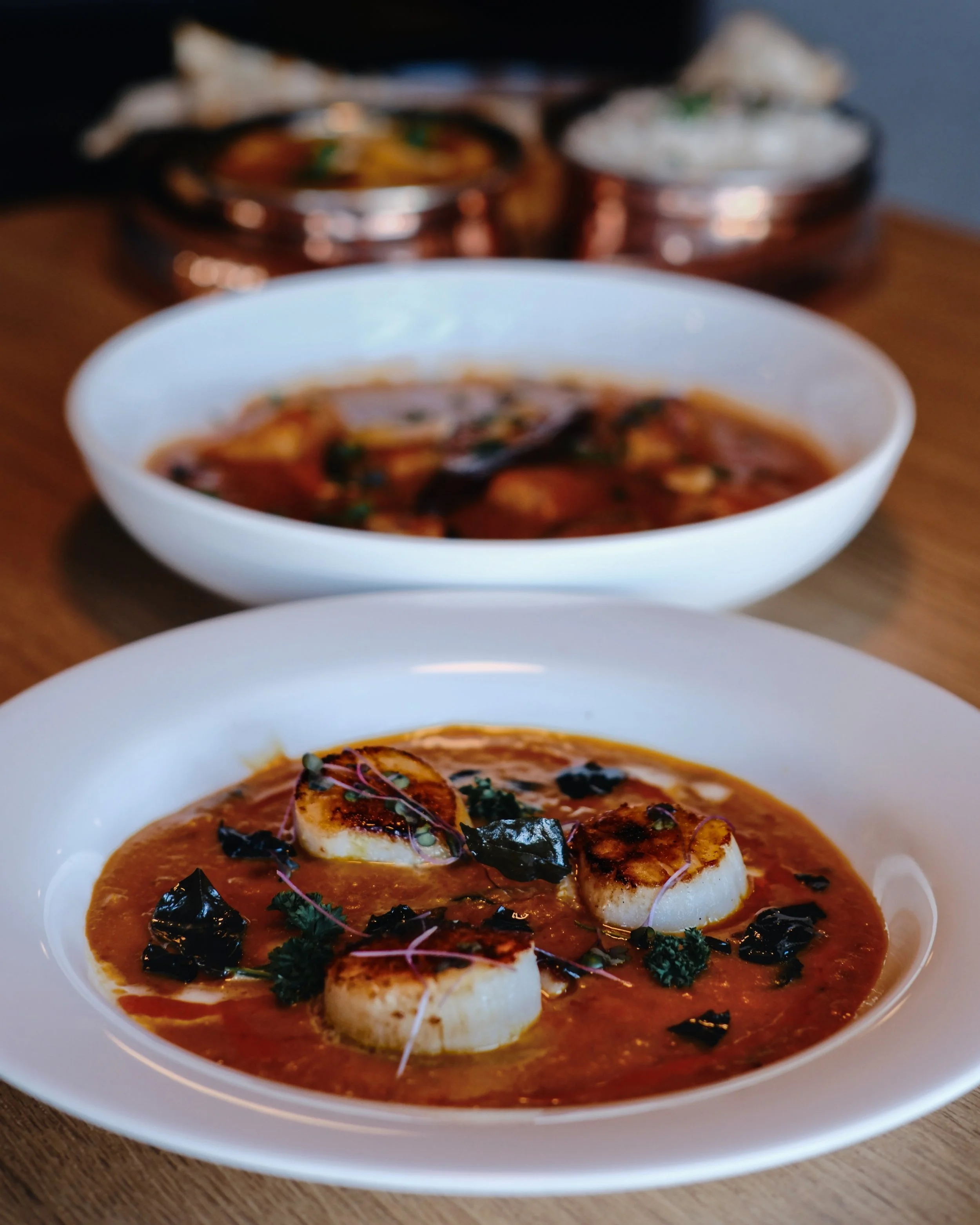 Succulent tandoori style Atlantic salmon gently simmered in a velvety, South Indian style coconut curry. Finished with a splash of cream and fresh herbs. Served with aged basmati rice and naan.