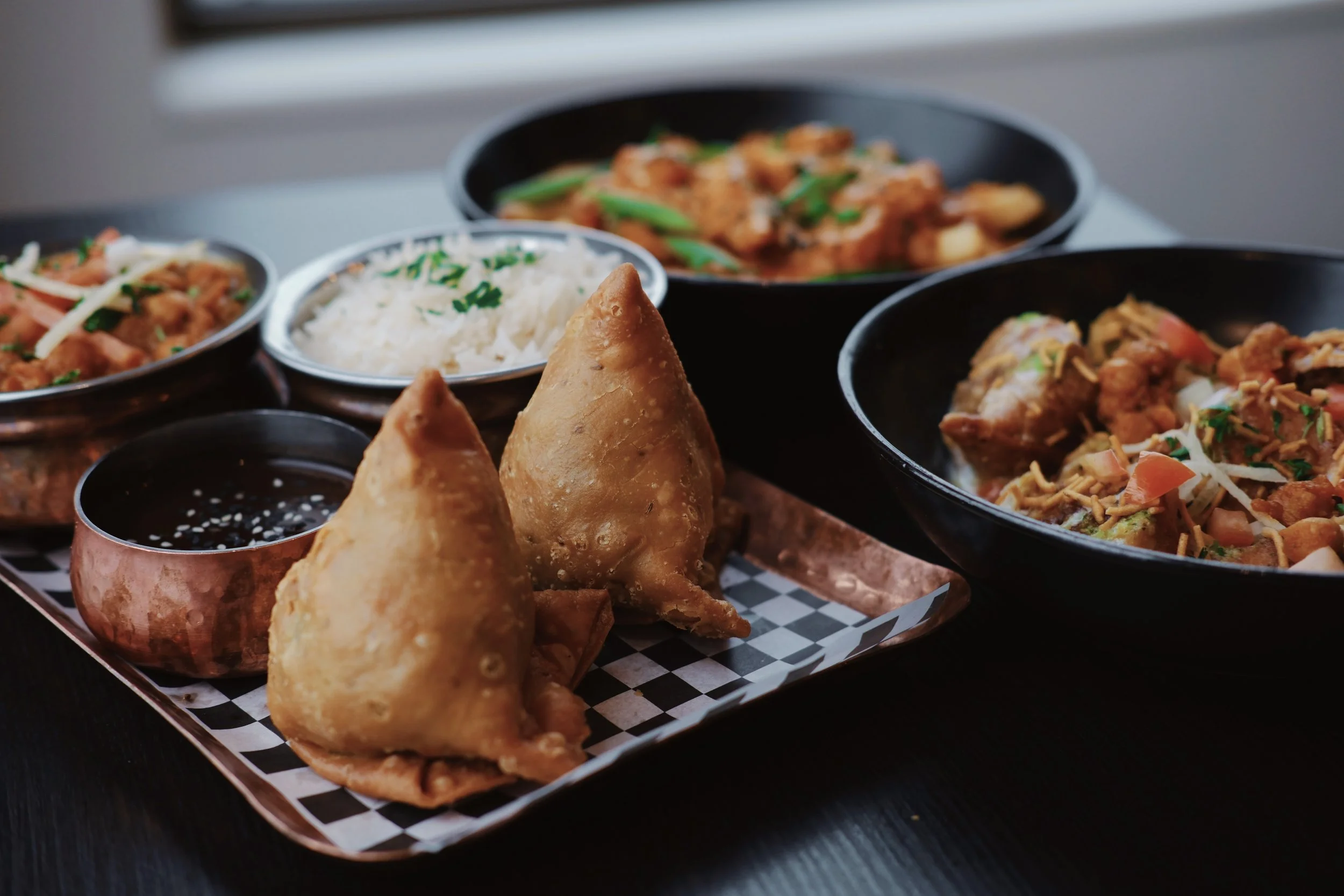 Two vegetable samosas mixed with chopped onions, tomatoes, tamarind, mint & yoghurt chutney.